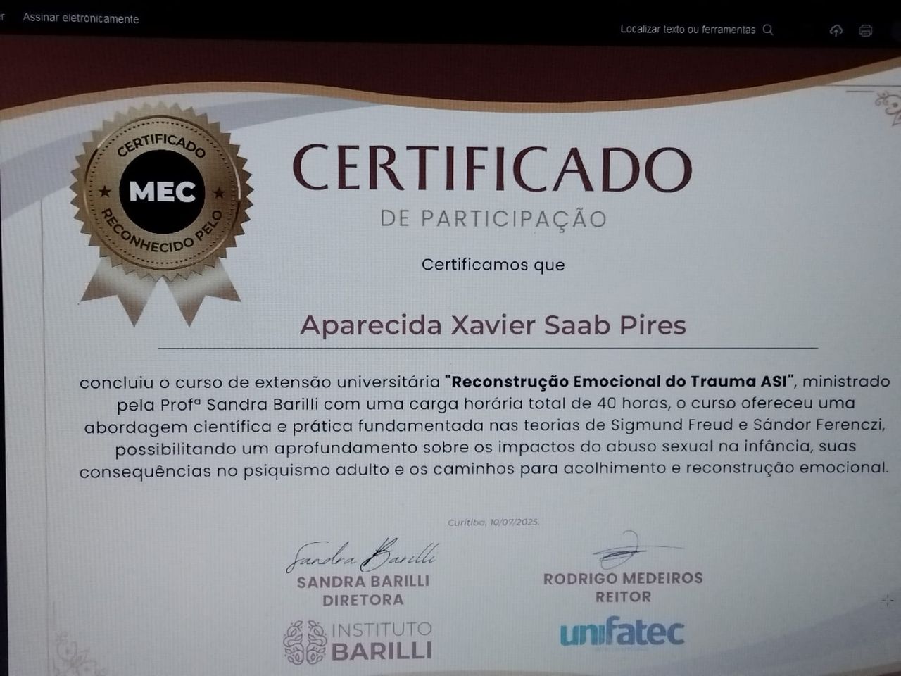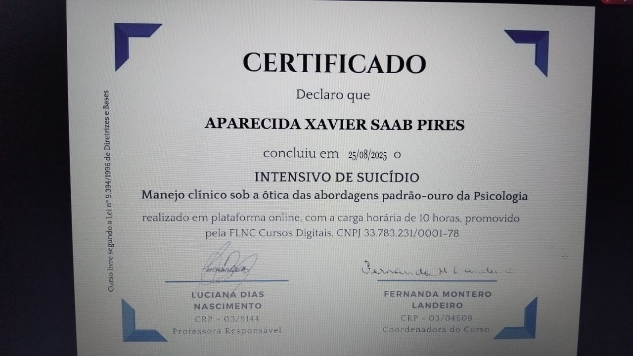 Estava ansiosa para conhecer a dra Aparecida foi atenciosa, ja pelo watts se mostrou dedicada, teve a paciência de explicar e detalher sobre o tipo de psicologia. Tenho certeza que meu filho estará em ótimas mãos(terapia).